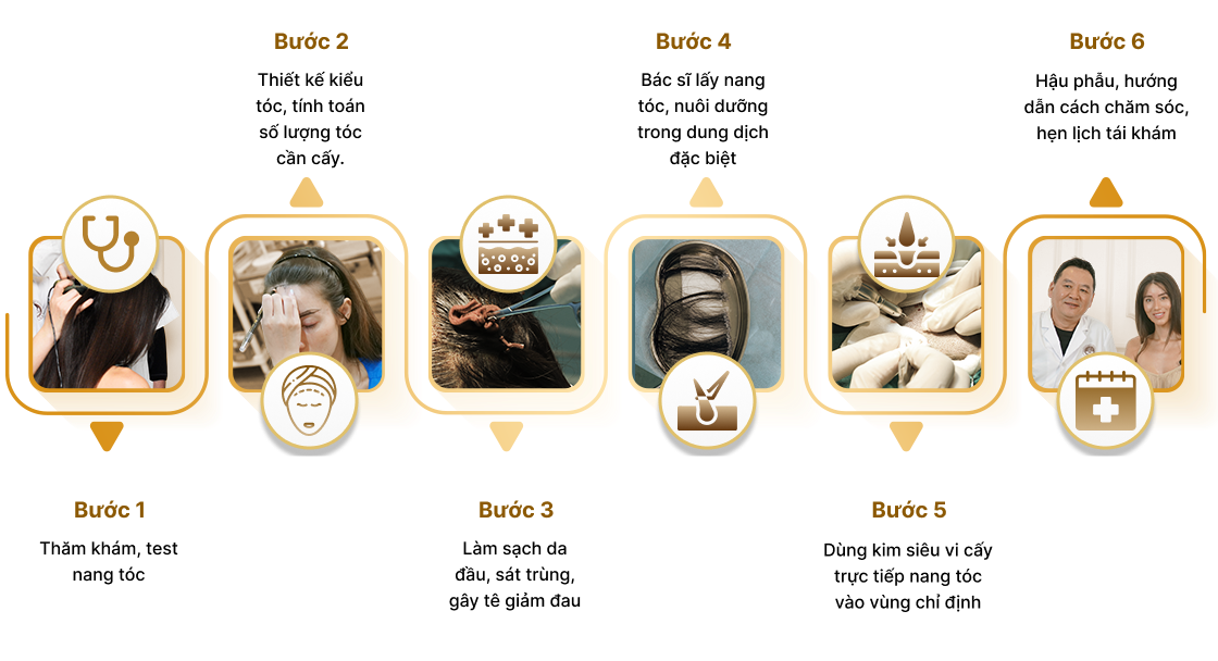 - Bước 5: Bác sĩ bắt đầu tiến hành cấy tóc tự thân bằng các thiết bị chuyên dụng